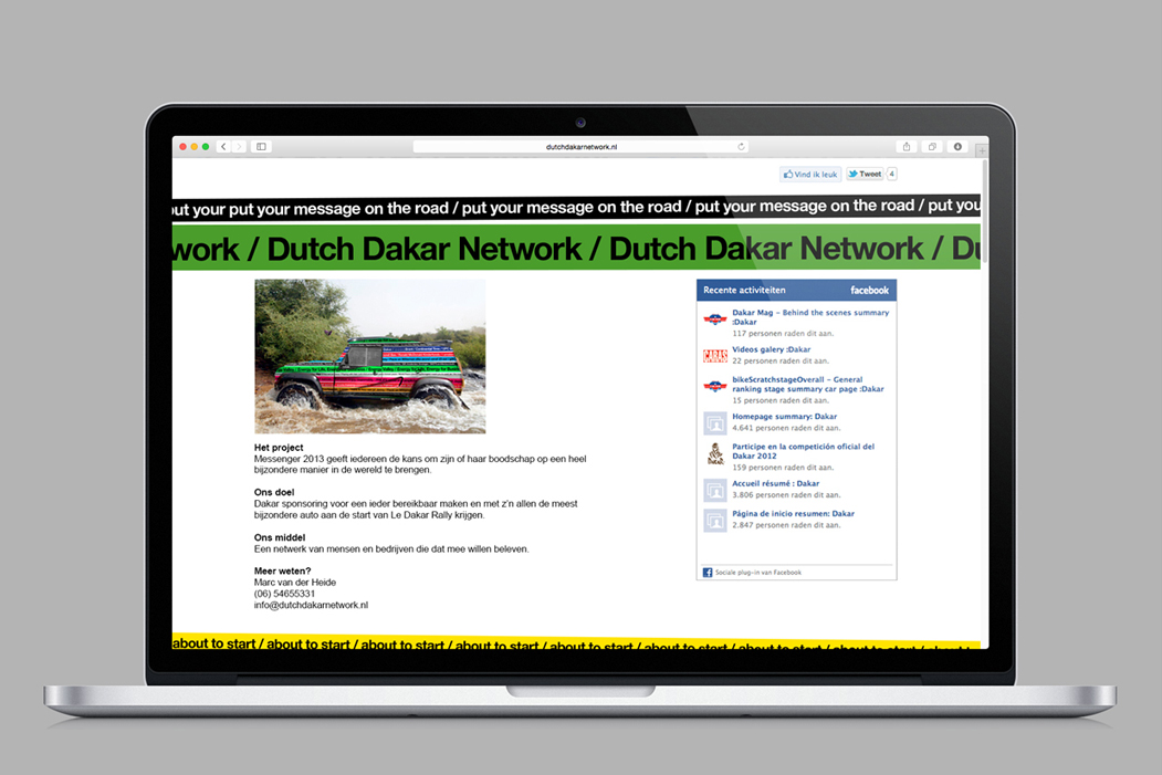 Dutch Dakar Network aimed through "Put your message on the road" to be able to drive the Dakar rally in 2013. And gave people the opportunity to sponsor the Dakar rally to make it accessible to everyone.